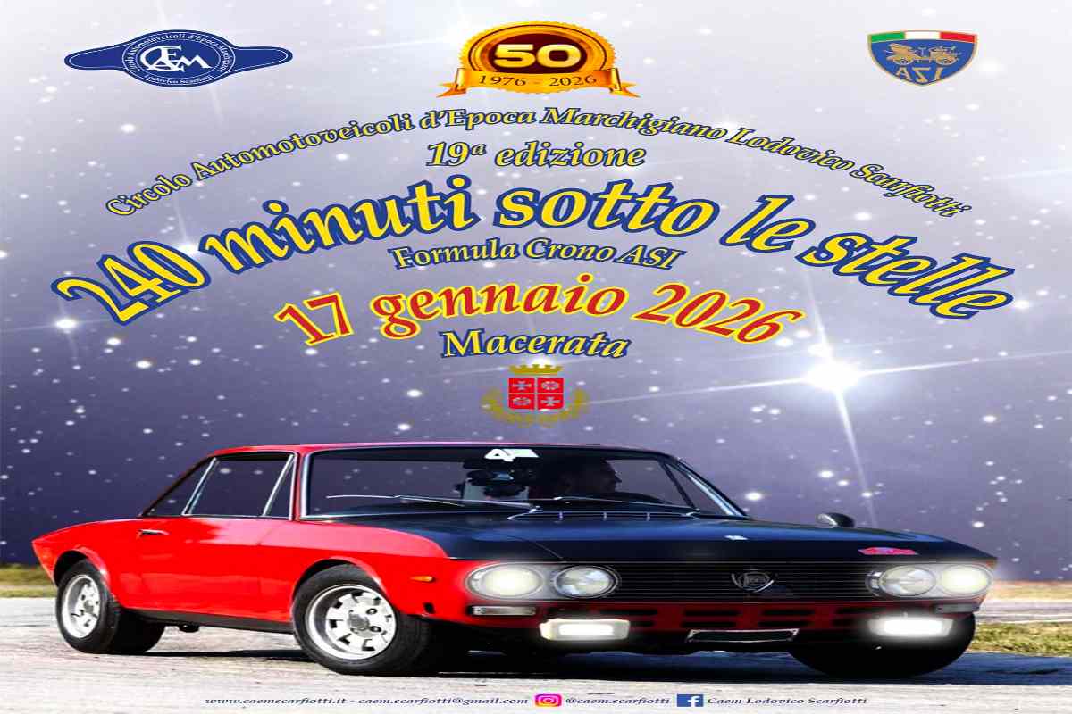 Montecassiano (Macerata) – Sabato 17 gennaio scatterà la stagione 2026 del CAEM/Lodovico Scarfiotti, con la 19^ edizione della “240 minuti sotto le stelle”, valida per il campionato Formula Crono ASI. L’evento inizierà all’imbrunire per terminare in serata colorando la centrale Piazza della Libertà con circa 50 auto d’epoca degli equipaggi provenienti da tutta l’Italia centrale ed oltre, con la presenza di numerosi specialisti del cronometro. L’ossatura della manifestazione prevede l’effettuazione di 60 prove di abilità divise in otto sezioni, lungo il percorso da coprire che misura 100 km. L’appuntamento per i partecipanti sarà dalle ore 14:30 alle 15:45 per espletare le operazioni preliminari. Durante questa fase chi vorrà potrà effettuare una visita guidata alla Torre Civica, costruita tra il XVI ed il XVII secolo, che ospita l’orologio astronomico recentemente ripristinato in base al progetto originario dei fratelli Ranieri di Reggio Emilia (1569). Dalle ore 15:45 ci sarà poi il briefing per i partecipanti con il saluto dello staff organizzatore e dell’assessore allo sport e turismo Riccardo Sacchi. Il via sarà dato ai partecipanti, un equipaggio alla volta, ad iniziare dalle 16:31 per affrontare il primo settore che terminerà con la sosta-ristoro di Cingoli alle ore 18 circa. Il secondo settore vedrà gli equipaggi tornare verso il capoluogo per raggiungere Piazza della Libertà dalle ore 20:30. Il primo settore porterà auto ed equipaggi verso il palasport Fontescodella per la prima sezione di prove, per proseguire verso Treia con seconda e terza sezione in località San Carlo (Il Villino) e San Lorenzo di Treia, poi si scenderà in direzione San Severino Marche-Cingoli per affrontare la quarta sezione nella zona sotto il crossodromo Tittoni. La sosta di metà percorso sarà poi presso la concessionaria Barigelli Auto in località Mummuiola di Cingoli. Da qui si riprenderà per il secondo settore disputando la quinta sezione di prove (crossodromo), la sesta a San Lorenzo di Treia, la settima presso Il Villino a Treia in zona San Carlo e l’ottava ed ultima in località Rotelli di Pollenza. La manifestazione si concluderà come detto con l’arrivo in centro storico di Macerata e la cena con le premiazioni presso il vicino Teatro della Filarmonica in Via Gramsci ospitato nel Palazzo Bourbon Del Monte, una suggestiva cornice d’interesse architettonico, ideale sede che inaugura la stagione 2026, anno del 50° anniversario di fondazione del CAEM/Lodovico Scarfiotti. Lo staff organizzatore ringrazia per il supporto Water M, Tecnostampa, Pigini Group, BCC Recanati e Colmurano, Autofficina F.lli Zacconi, GM Meccanica, Ca.Bi. Gomme, Concessionaria Barigelli Auto e Papa Nicola edilizia stradale.